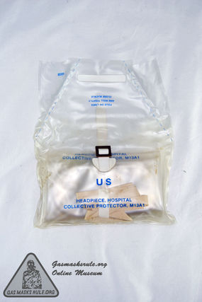 The Headpiece, Hospital Collective Protector, M13A1 is part of the Filter Unit, Gas-particulate: Hospital, Six-man, 12 CFM, ABC-M7A1.The M13A1 would be connected to an M2A2 air purifier via a hose attached to the 60mm threaded inlet valve. Six M13A1 headpieces are included in the ABC-M7A1. The M13A1 is stored in an M12 Protector Hospital Headpiece Carrier (pictured).